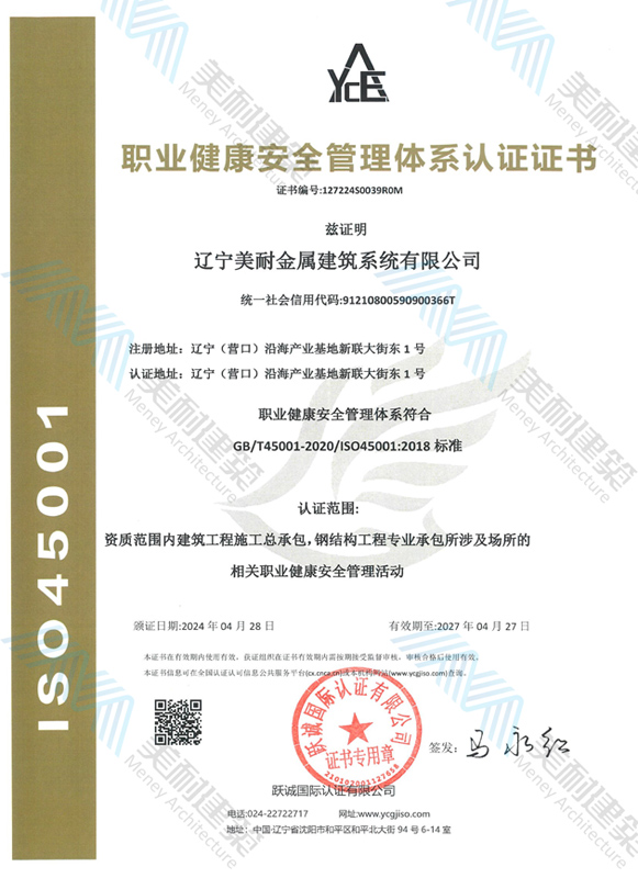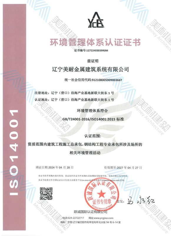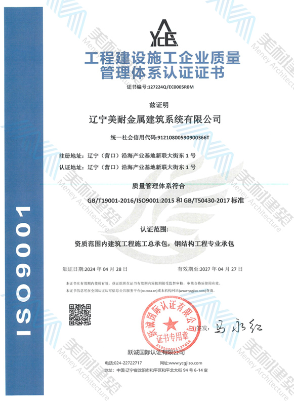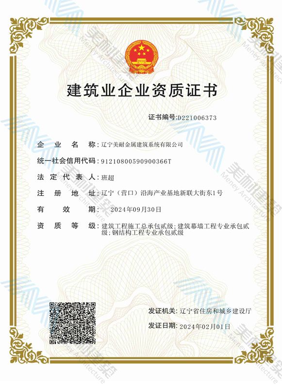 遼寧美耐金屬建筑系統(tǒng)有限公司位于遼寧(營口)沿海產(chǎn)業(yè)基地,專注于預(yù)制金屬建筑系統(tǒng)領(lǐng)域,是一家集工業(yè)建筑設(shè)計、制作、施工及相關(guān)的技術(shù)咨詢與服務(wù)為一體的綜合性服務(wù)企業(yè)。作為國家鋼結(jié)構(gòu)協(xié)會會員、中國建筑金屬結(jié)構(gòu)協(xié)會會員單位與國家高新技術(shù)企業(yè),美耐建筑集建筑工程施工總承包、鋼結(jié)構(gòu)工程專業(yè)承包等多種資質(zhì)于一身,并擁有22項鋼結(jié)構(gòu)建筑領(lǐng)域?qū)@?項軟件著作權(quán)。